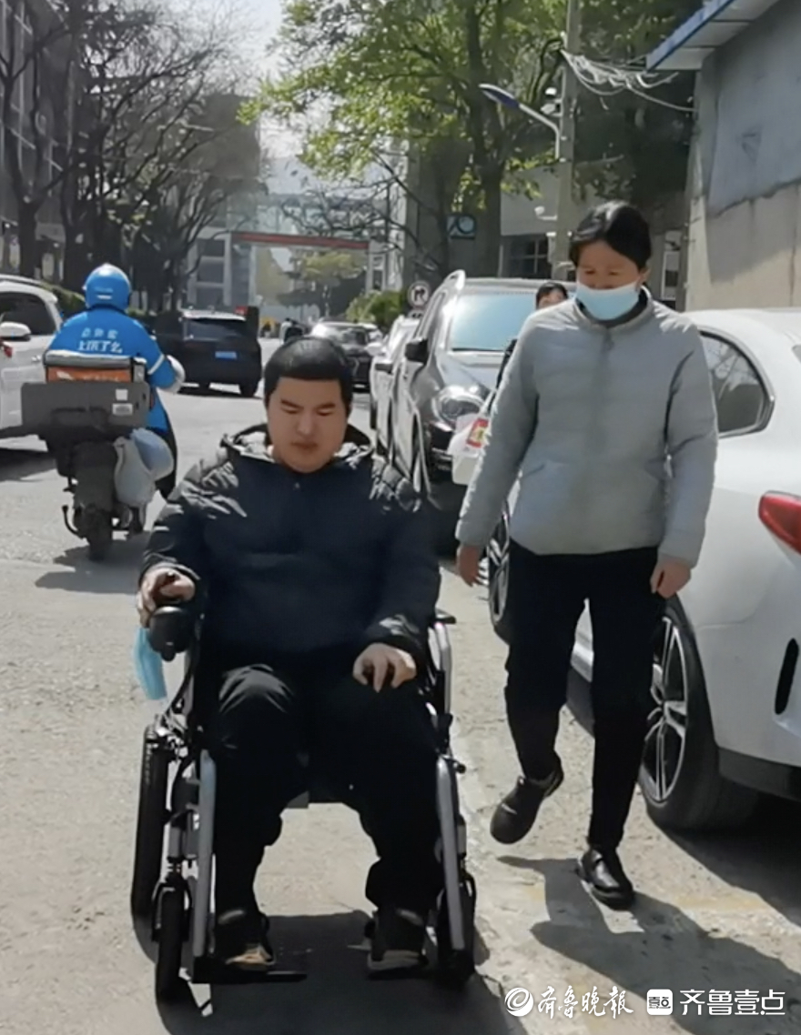 在妈妈的陪伴下,赵守杰穿梭在马路上。