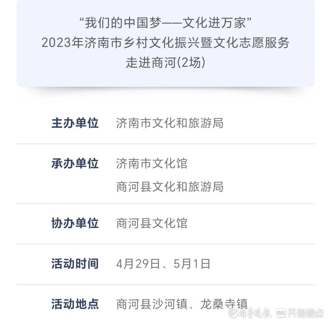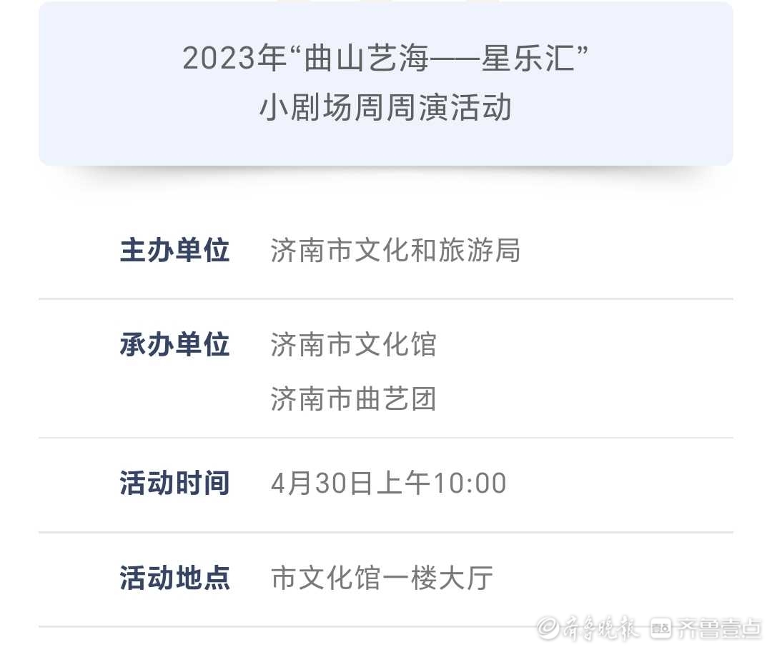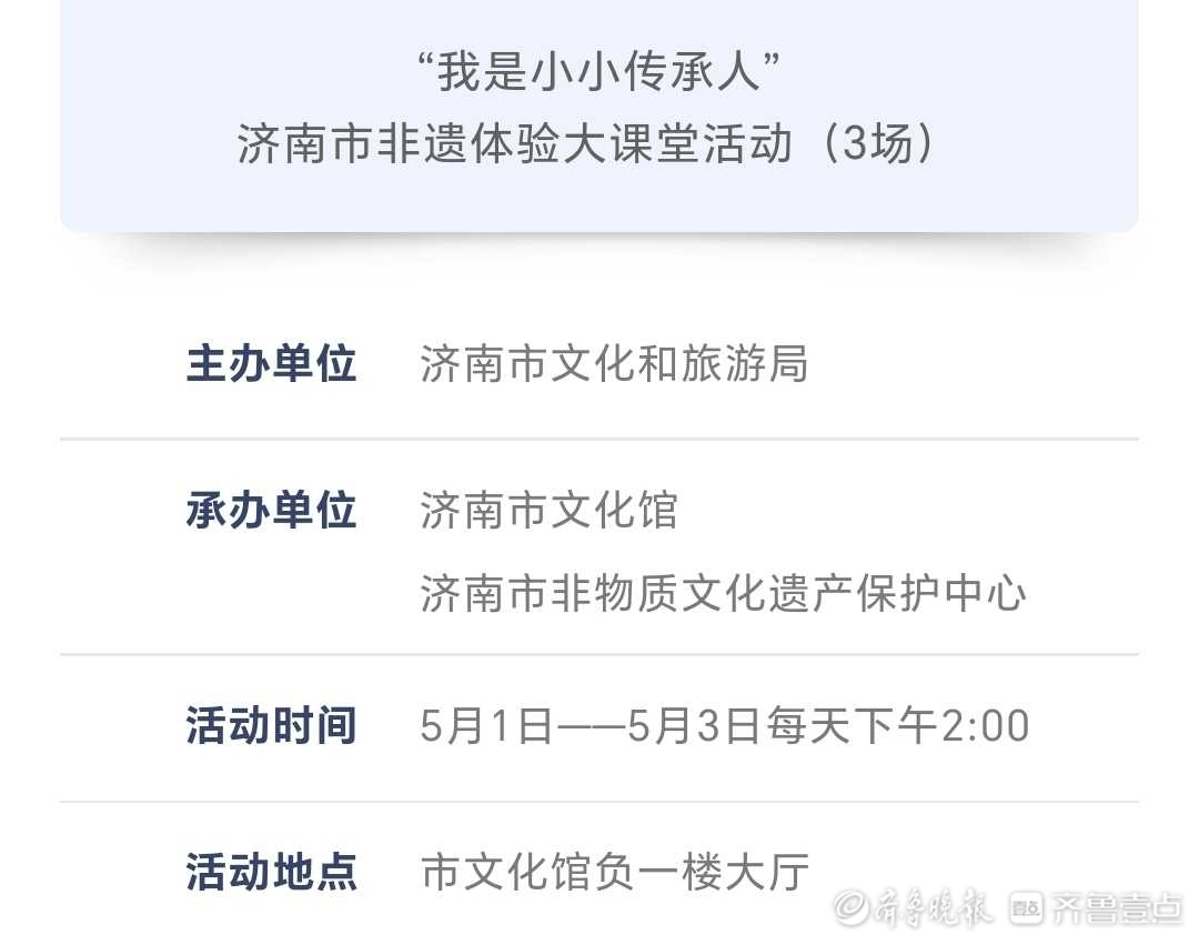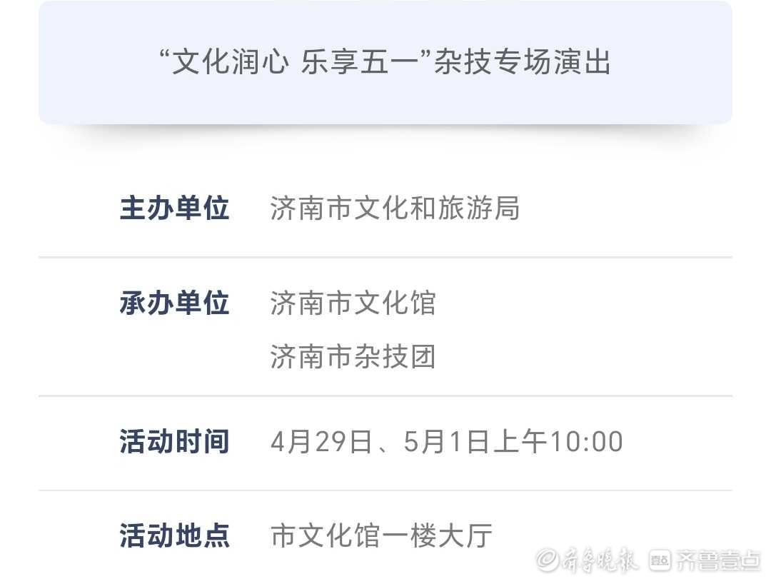 近日,记者从济南市文化馆了解到,为进一步丰富市民假期文化生活,济南市文化馆发布了一系列“五一”假期活动,包括杂技专场演出、皮影戏展演等多项活动。