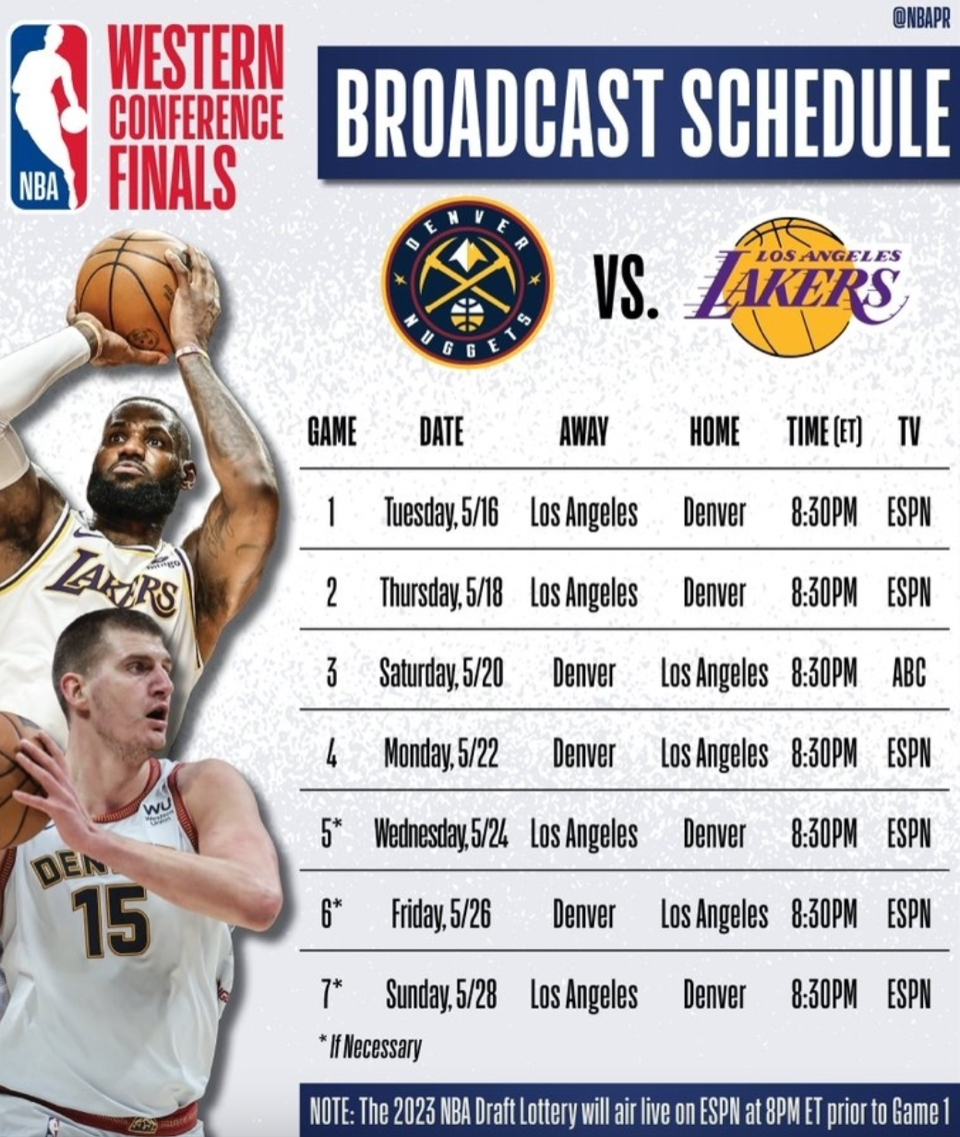随着湖人与掘金会师西决,两队的具体赛程也随之出炉(北京时间):