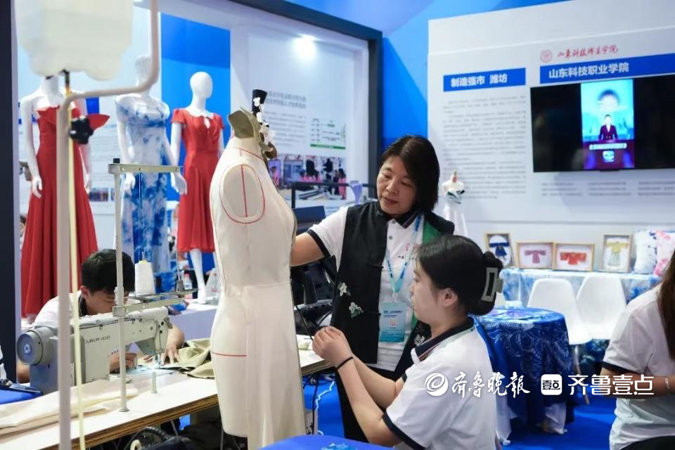山东科技职业学院聚焦“制造强国”和“一带一路”2个板块,以“建设智能制造特色双高计划院校 服务山东先进制造业强省”和“‘引进来+走出去’双向发力 打造‘山科职教’国际化品牌”为主题,多维度展示了学院近年来的重大建设改革成果。在主题展“制造强国”板块,学院机电一体化专业的学生现场展示了智能制造生产线综合调试技术技能。国家“双高计划”服装设计与工艺专业群的学生现场展示了高级礼服立体裁剪和手工造花技术技能。在现场,师生以技术服务形式为第40届潍坊国际风筝会设计制作的风筝创意主题服装引人入目;在主题展“一带一路”板块,来自乌兹别克斯坦、几内亚等国家的留学生在老师的指导下现场展示盘扣、中国结、扎染的制作工艺。来自几内亚的留学生陈颖和乌兹别克斯坦的留学生乌恺在制作过程中兴奋地说,“我们对扎染很感兴趣,扎染很奇妙,感受到了中国非遗扎染技艺的魅力。”