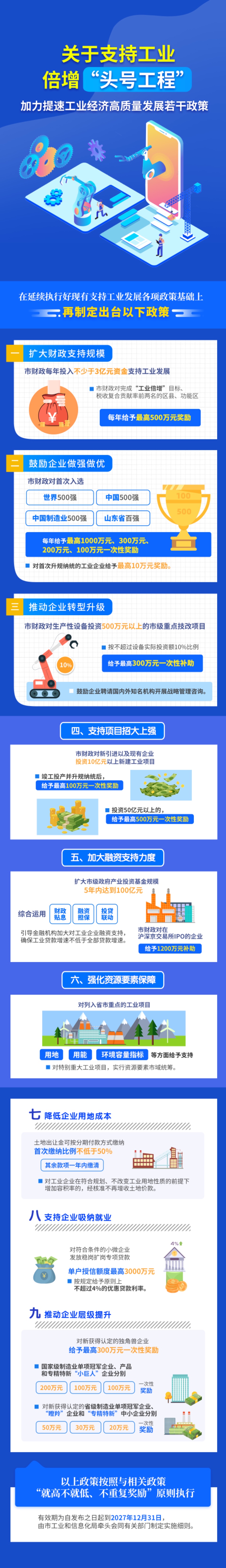 与此同时,在执行现有政策的基础上,《行动方案》新出台了9项政策支持工业发展,通过加大奖励力度、优化资源配置等多种措施持续提升供给政策活力。通过市财政每年投入不少于3亿元资金支持工业发展。市财政对完成“工业倍增”目标、税收复合贡献率前两名的区县、功能区,每年给予最高500万元奖励。同时,市财政对首次入选世界500强、中国500强、中国制造业500强和山东省百强的工业企业,分别给予最高1000万元、300万元、200万元、100万元一次性奖励,对首次升规纳统的工业企业给予最高10万元奖励。