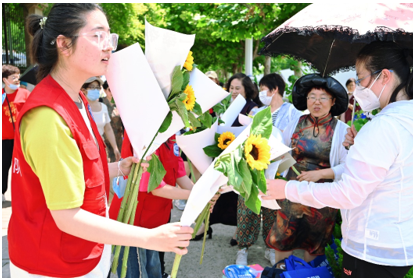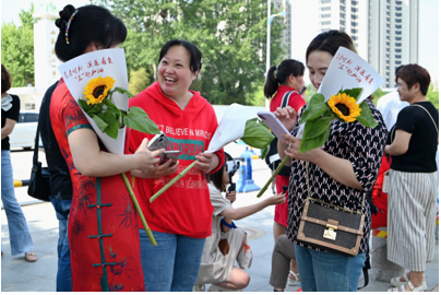 6月7日,2023年夏季高考第一天。早上8时许,滨州医学院康复医学院20多名志愿者第一站来到莱山一中考点指定区域,为入场前的考生和陪送家长赠送鲜花祝福和矿泉水,送出滨医爱的表达:高考时刻,“益”起加油!这是滨州医学院康复医学院设立“情绪休养爱心驿站”爱心助考的一站场景。高考期间,志愿者还将陆续到其它考点为考生送祝福、助力加油!