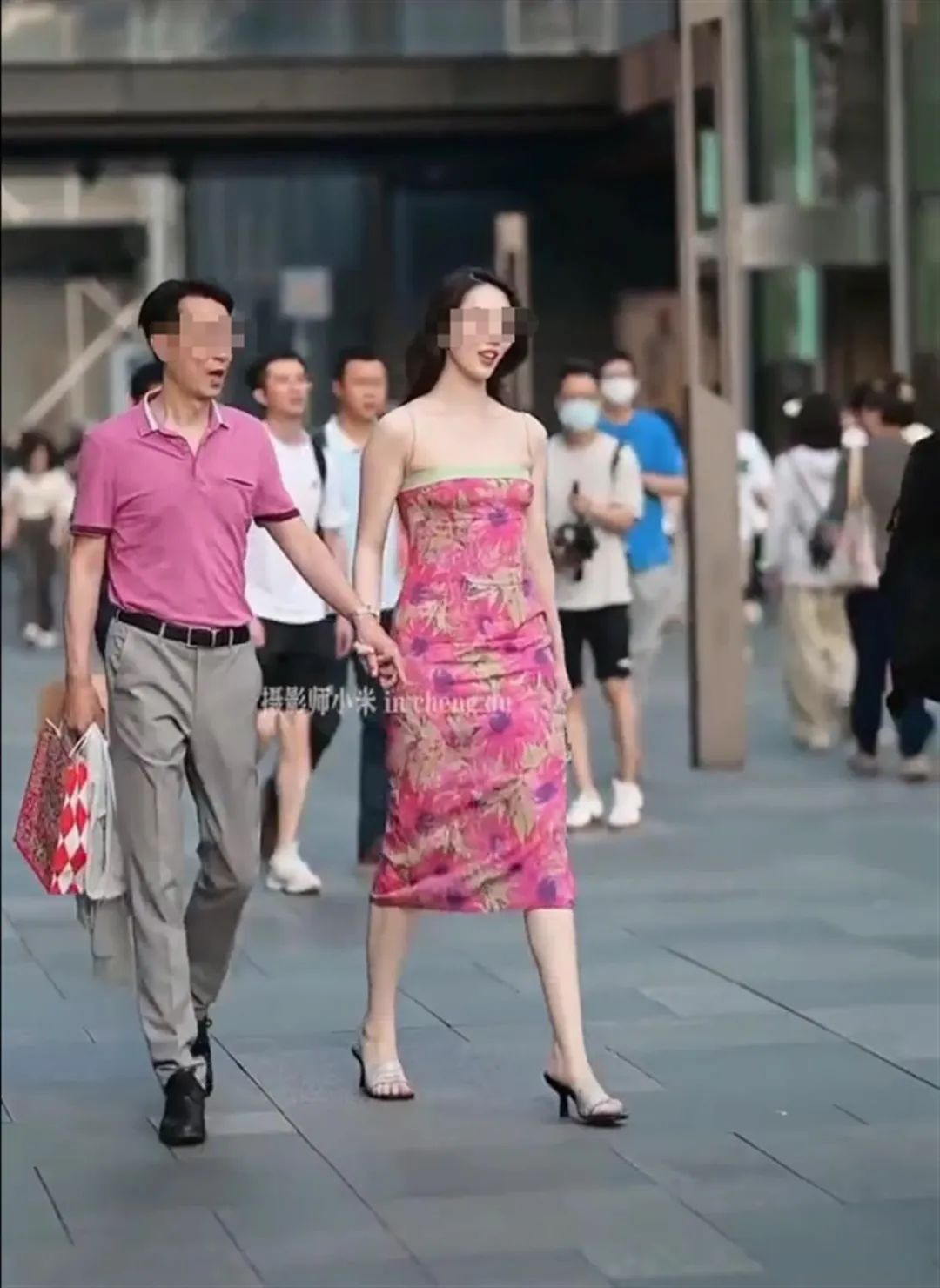 网传视频部分镜头显示,一名玫粉色上衣男子与一名衣着靓丽的女子牵手走在街道上,有说有笑。