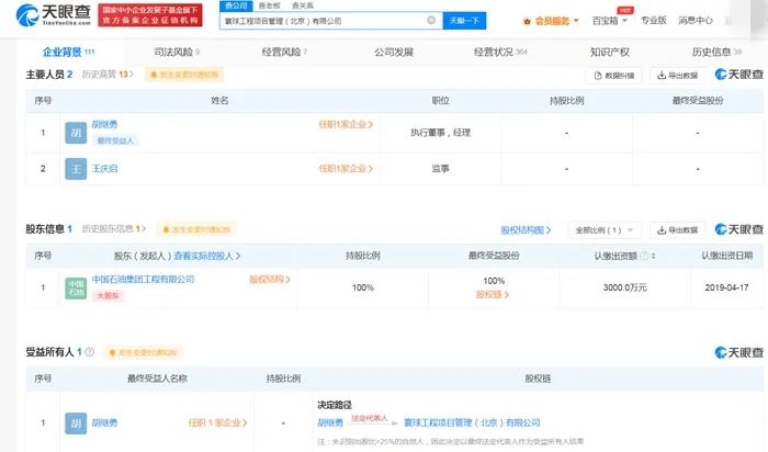 天眼查显示,寰球工程项目管理(北京)有限公司成立于1995年,是中国石油天然气集团成员,位于北京市,是一家以从事专业技术服务业为主的企业,注册资本3000万元,法定代表人为胡继勇。