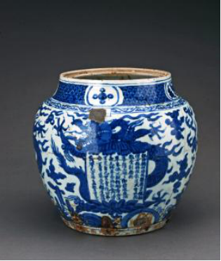 另外,该香炉原器名“青花云龙纹瓶”,当时定名是从其铭文“……程时振敬造大青花瓶一副……”而来。有研究者认为,此器与传世的一批原为双耳三足鼎式炉的残器一样,器口、双耳、三足均缺失。其原用于插配双耳的器肩处对称双方孔,以及器腹下等对三圆孔,被填补以充瓶罐之用,成了名副其实的“大青花瓶”,然而其复原后实为双耳三足鼎式炉(梦笔:《遇物自成趣——香港艺术馆藏天顺青花瓶与杨氏家族》,《收藏家》2018年第9期)。从该器肩部和腹部的空洞来看,这些空洞是有规律分布的,故应命名为“青花云龙纹香炉”。