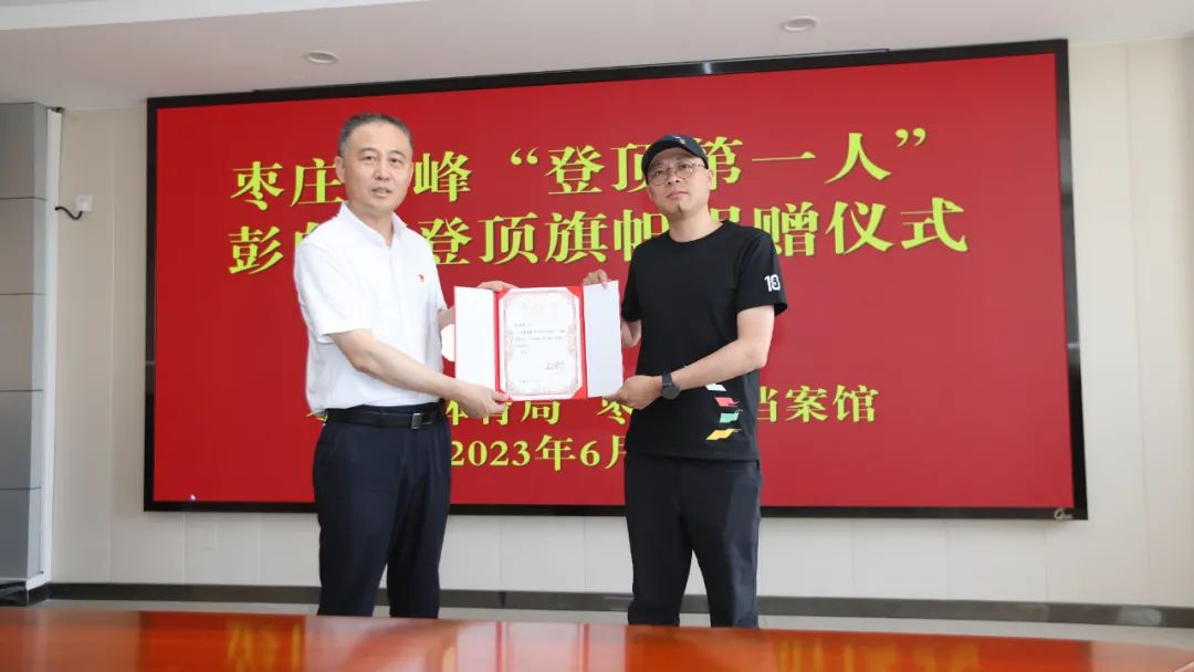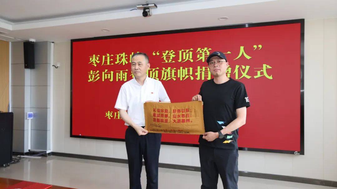在第16个国际档案日即将来临之际,6月7日上午,枣庄珠峰“登顶第一人”彭向雨登顶旗帜捐赠仪式在市档案馆五楼会议室举行。市档案馆馆长周建,市体育局党组成员、副局长赵宇浩,珠峰登顶队员彭向雨,滕州市张汪镇相关人员参加捐赠活动。