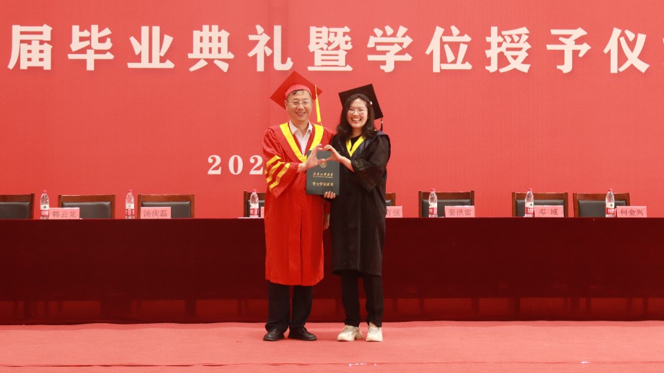 刘玉为毕业生代表一一拨穗正冠、颁发学位证书并合影留念。