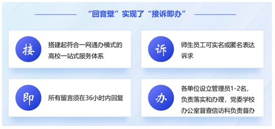 高度重视,畅通接诉即办的渠道。学校践行宗旨意识,有机整合“校长信箱”“回音壁”等资源,在校园网主站设立“网上民声”专栏,拓宽了广大师生员工反映教育教学、日常管理、后勤服务等事项的咨询、求助、建议、投诉等诉求的渠道。“回音壁”实现了“接诉即办”:“接”,搭建起符合一网通办模式的高校一站式服务体系;“诉”,师生员工可实名或匿名表达诉求;“即”,所有留言须在36小时内回复;“办”,各单位设立1-2名管理员,负责落实和办理。“回音壁”能够顺畅反映师生的诉求,成为学校通过小切口解决大问题的有效方式。