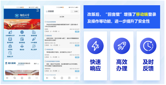 持续探索,完善接诉即办的功能。聚焦中央和省委关于“民呼我为”“接诉即办”具体要求,学校及时对“回音壁”功能进行了完善。前台显示留言时间,后台可实现对基础信息的更新维护;增加转办功能,对非本部门业务范围内的问题进行转办操作,后台对转办全过程进行显示;增加显示办理时限,便于督查督办。改版后的“回音壁”增强了移动端登录及操作等功能,进一步提升了安全性,实现了快速响应、高效办理、及时反馈。主题教育以来,收到师生员工“回音壁”诉求留言935条,已办结927条。