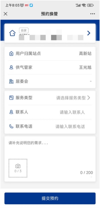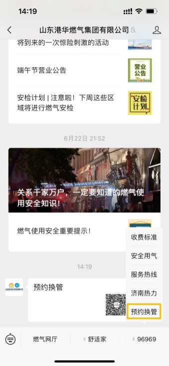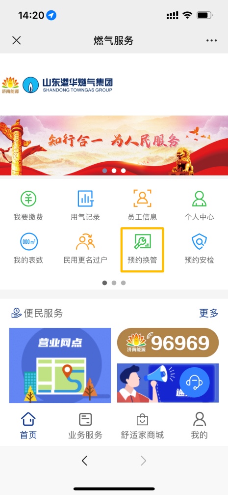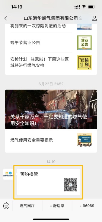 此预约服务也可通过点击官方微信服务号首页【燃气网厅】菜单键,进入【燃气服务】首页 “预约换管”快捷按钮,直接进入预约界面,完成预约登记。