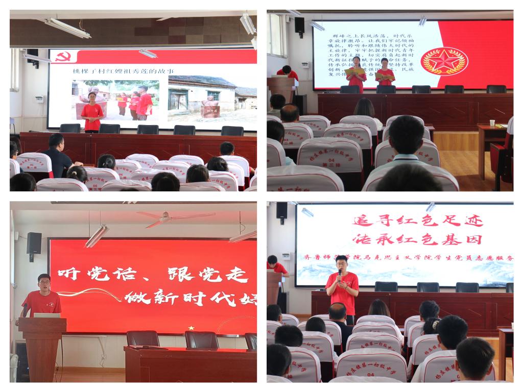 敢想敢为、善作善成——立志做新时代好青年。星火青年服务队探究乡村振兴成功经验,立足学科特色,发挥专业优势,分别以“传承红色基因,争做青年先锋”“听党话,跟党走,做新时代好青年”为主题,为杨庄镇第一初级中学的共青团员们讲述了一堂精彩的思政课,将理论与实践相结合,阐释了沂蒙精神的丰富内涵与切身感悟;带领共青团员开展了“初心颂”经典诵读活动,重温了马克思关于《青年在选择职业时的考虑》以及习近平总书记在纪念五四运动100周年大会上的讲话,感悟经典魅力,教育引导共青团员们练就过硬本领,红心向党,奔赴远方。
