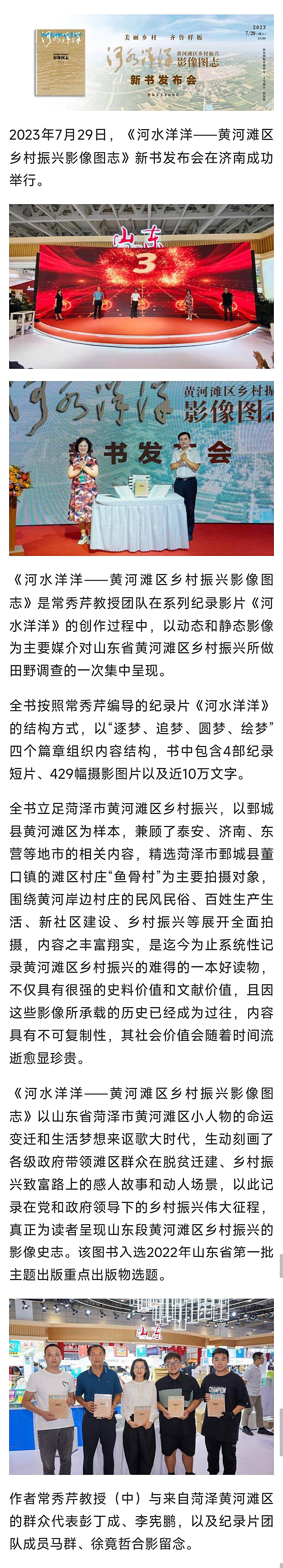2023年是我国全面推进乡村振兴重点工作之年。 山东艺术学院常秀芹教授的著作《河水洋洋——黄河滩区乡村振兴影像图志》系统性记录了2018-2022这五年来,山东省黄河滩区由脱贫攻坚全面转到乡村振兴的一段珍贵的历史性进程。