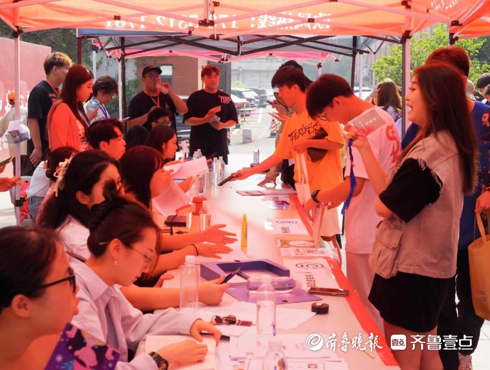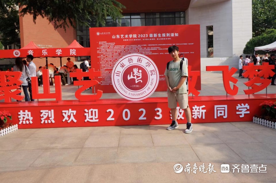 9月3日,山东艺术学院文东校区, 来报到的新生们开心地走进校园,并在迎新处的标语前留影。各个学院设立了迎新站为新生服务,并引导他们办理各种手续,现场气氛热烈。