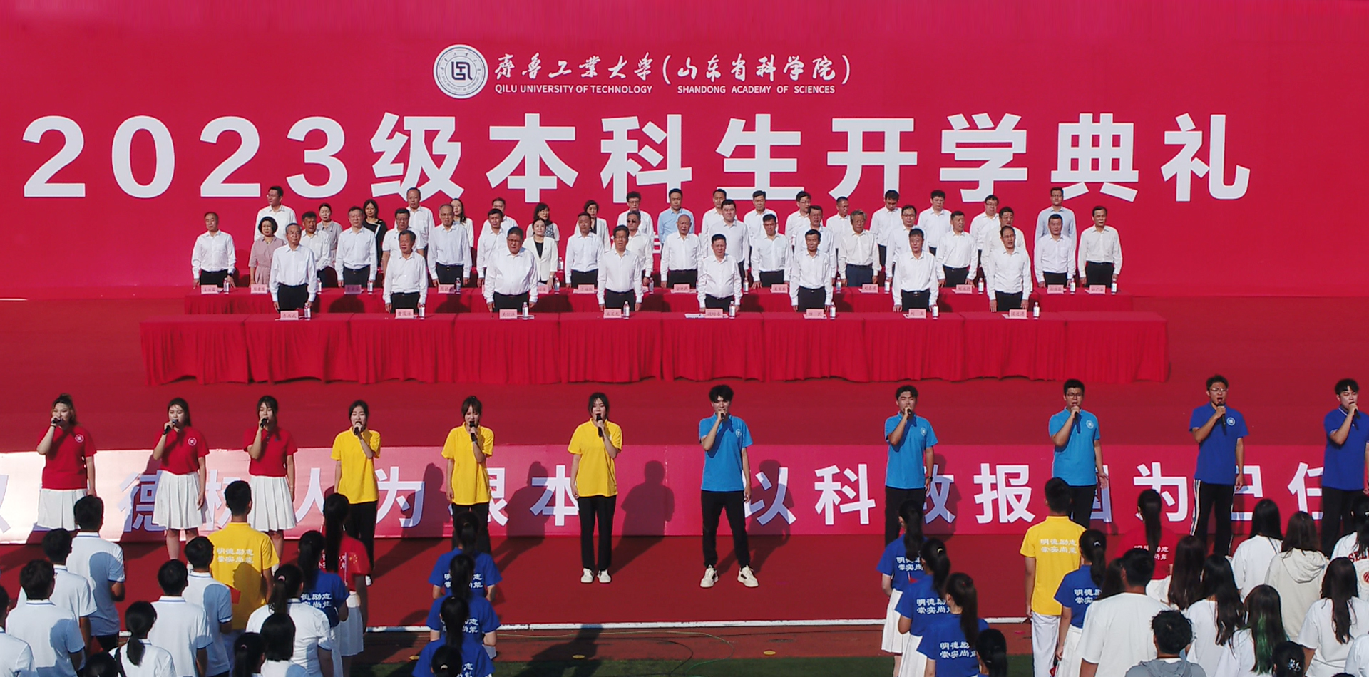 典礼最后,2023年全部录取专业的新生代表集体朗诵《请党放心,强国有我》。伴随着同学们的铮铮誓言,齐鲁工业大学(山东省科学院)2023级本科生开学典礼圆满落幕。
