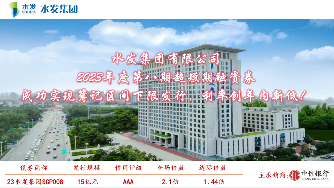 9月19日,水发集团在银行间市场成功簿记发行2023年第八期超短期融资券,募集资金15亿元,期限180天,较上期发行利率降低120bp,全场认购金额31.5亿元,认购倍数2.1倍,边际倍数1.44倍,得到公开市场投资者大力支持。