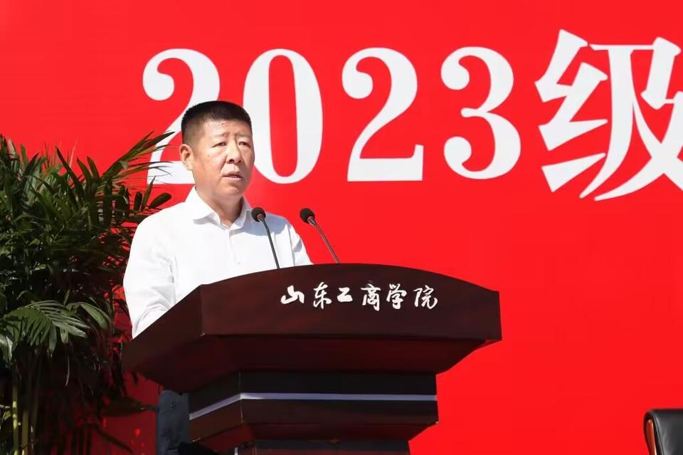 9月22日上午,山东工商学院2023级新生开学典礼暨军训总结表彰大会在东校区田径场举行。学校领导郭建国、陶虎、张宗伟、刘冰、杜曙光、李希亮出席典礼。军训团领导受邀出席,党委委员、副院长贾海宁主持典礼。