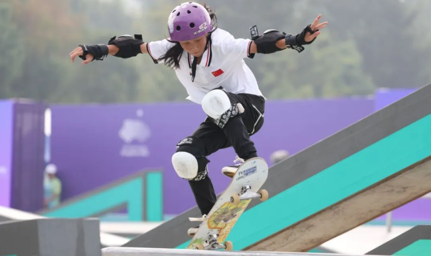 9月27日,杭州第19届亚运会滑板决赛在钱塘轮滑中心举行,经过两轮“线路”和五轮“大绝招”比拼,年仅13岁的中国选手崔宸曦夺得金牌,成为中国亚运史上最年轻的个人项目冠军。2009年12月出生的她,也是本届杭州亚运会中国体育代表团中最年轻的运动员。