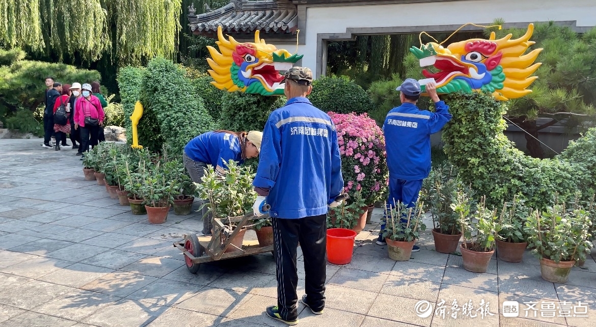 在趵突泉公园北门,一处以龙为造型的菊花景观映入眼帘,现场园林工人正在摆放菊花盆景。“根据设计,迎面墙体屏风前这个位置,菊花盆景将摆设成‘二龙戏珠’造型,周边菊花的品种和颜色也相应进行一些搭配。”正在施工的园林工人告诉记者。
