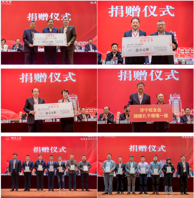 捐赠仪式中,北京校友会、深圳校友会捐赠100万元,临沂校友会捐赠10万元,建筑学院2007级校友朱柯蒙和母亲共同捐赠10万元,济宁校友会捐赠孔子雕像一座,部分校友设立奖助学金、参加“绿色烟园”树木认养活动。学校领导代表学校依次接受校友捐赠,北京校友会常务副会长董一鸣、深圳校友会副会长梁立伟、临沂校友会会长杨中锋、建筑学院2007级校友朱柯蒙的母亲孔英姿、济宁校友会负责人李贵维,校友代表姜华、王伟、隋阳旸、孙伟、董锟、庞磊、徐康、张海涛、邢雷、韦如雷、张建伟、卢佳琦等到主席台接受捐赠证书。