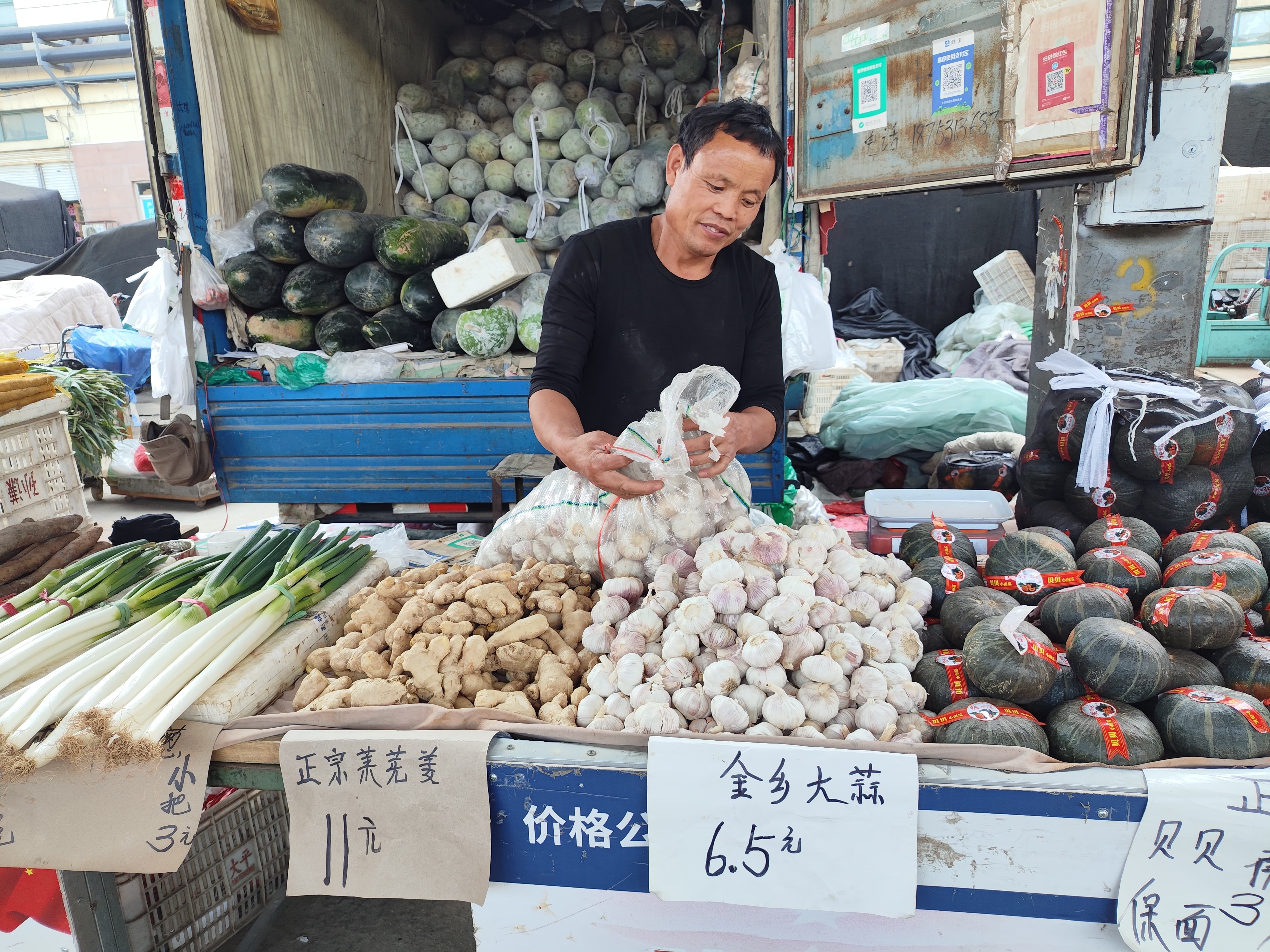 11月1日,记者走访济南市七里堡蔬菜综合批发市场发现,大蒜产地大多来自金乡县,零售价在6.5—7元/斤,批发价在5.8元/斤左右。商家大多反映,大蒜价格比去年同期贵了一半左右,但近几个月内变动不大,只在几毛钱之间浮动。