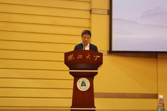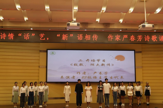 湖北大学党委副书记侯勇在致辞中表示,严春芳诗歌高校行有利于丰富校园文化生活,促进文化经典薪火相传,其诗歌创作是当代文坛上一道独树一帜的风景。他的诗文集《为荷而来》《太阳与大海》出版后,受到广大读者的喜爱好评。在严老师的诗文世界中,给读者留下深刻印象的,莫过于他对于浩渺海洋的情有独钟,在山川大海的自然景观中探寻出富含哲理的人文情思。同学们这次朗诵严春芳诗人的作品,以海洋主题,要体会诗歌的韵律与美感、感悟诗歌的意境与内涵。