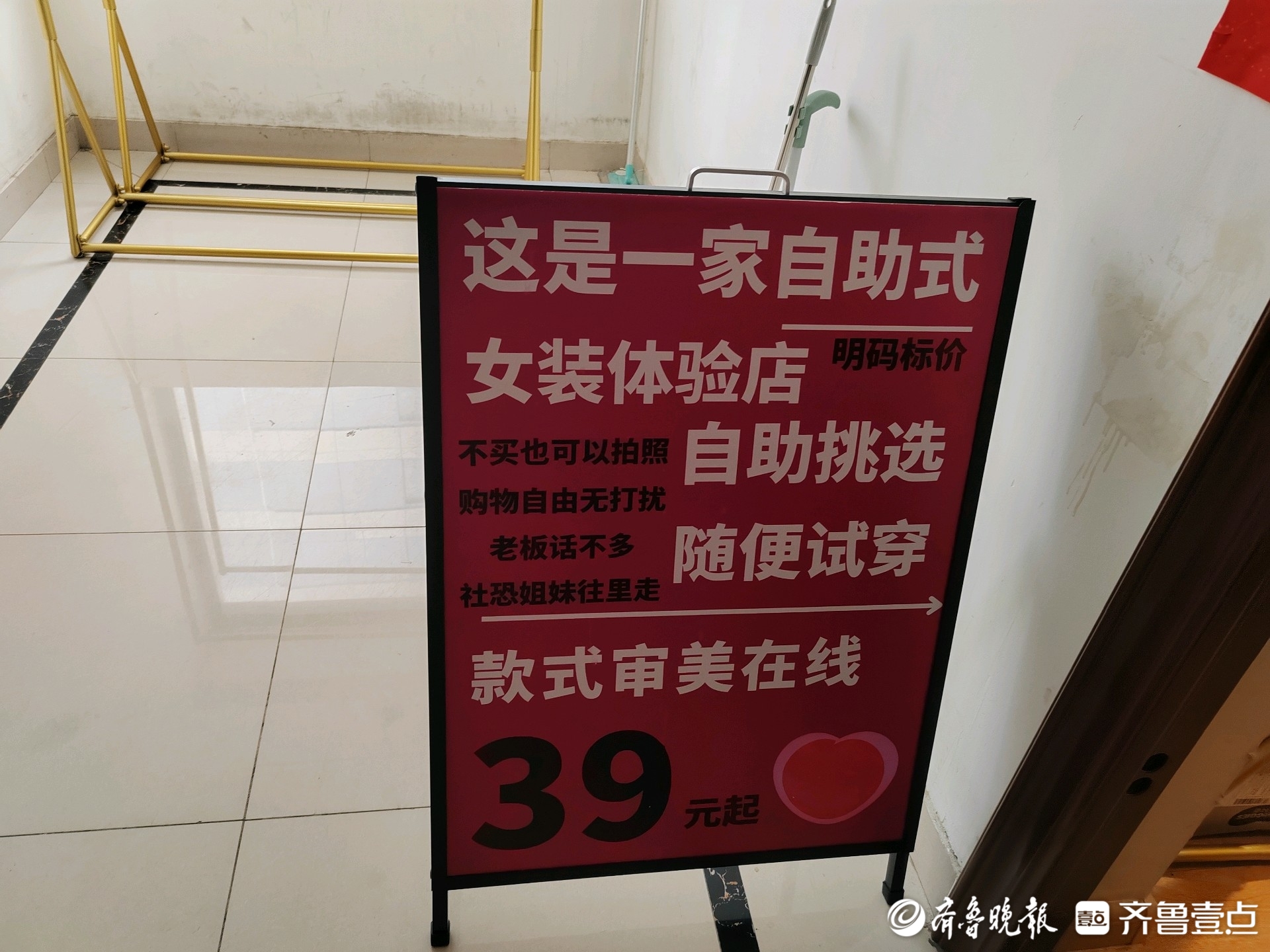 在济南市高新区的万达广场,记者发现了4家自助女装店。在某店门口,张贴着进店购物的流程:联系店主开门进店——进店试穿——喜欢衣服微信联系店主计算价格。也有自助女装店门前的海报写着:“不买也可以拍照”“购物自由无打扰”“社恐姐妹往里走”。