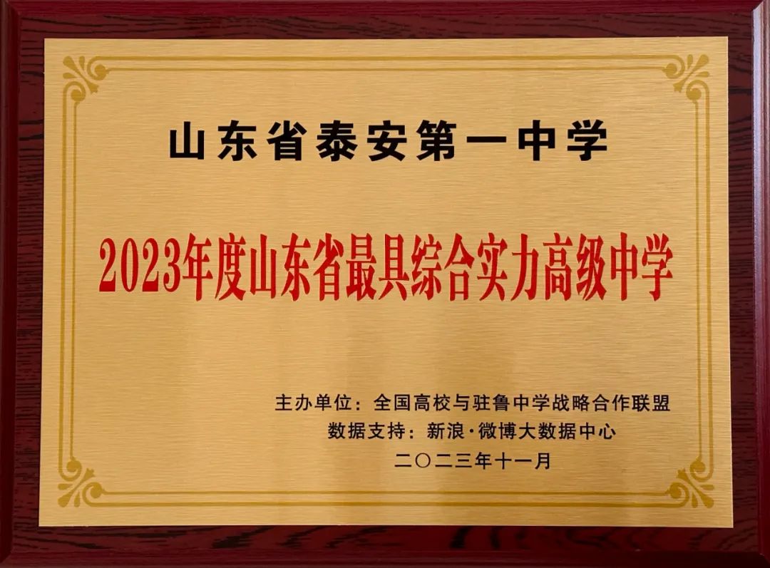 通讯员 吴韶瑾 11月9日,全国高校与驻鲁中学战略合作联盟2023年度山东中学教育盛典隆重举行,104所重点中学校长和10余所高校负责人参加活动。会上,泰安一中被评为“2023年度山东省最具综合实力高级中学”。 会议期间,部分重点高中及高校领导从不同角度分享了教育教学经验,与会代表共同探讨了如何开展新型教学模式,交流了在实践育人与学生发展方面的指导方法。 泰安一中将以此获奖为契机,加强与各兄弟学校间的沟通交流,完善教师队伍建设,提高人才培养质量,推进高中教育改革,谱写教育高质量发展新篇章。