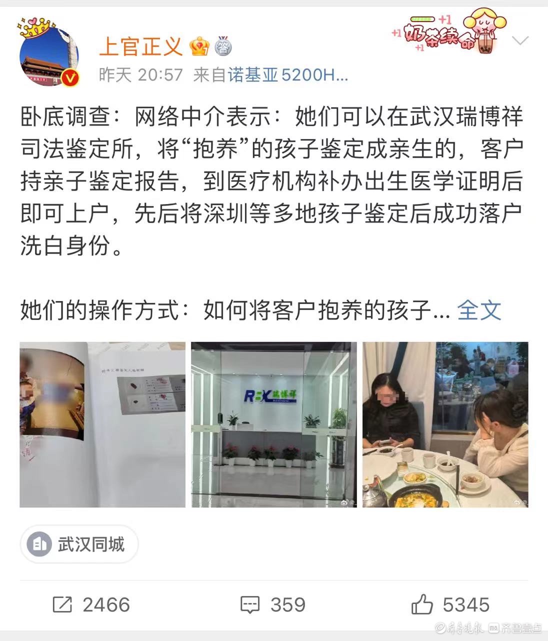 11月24日,上官正义发文,“网络中介表示,她们可以在武汉瑞博祥司法鉴定所,将‘抱养’的孩子鉴定成亲生的,客户持亲子鉴定报告,到医疗机构补办出生医学证明后即可上户,先后将深圳等多地孩子鉴定后成功落户洗白身份。”
