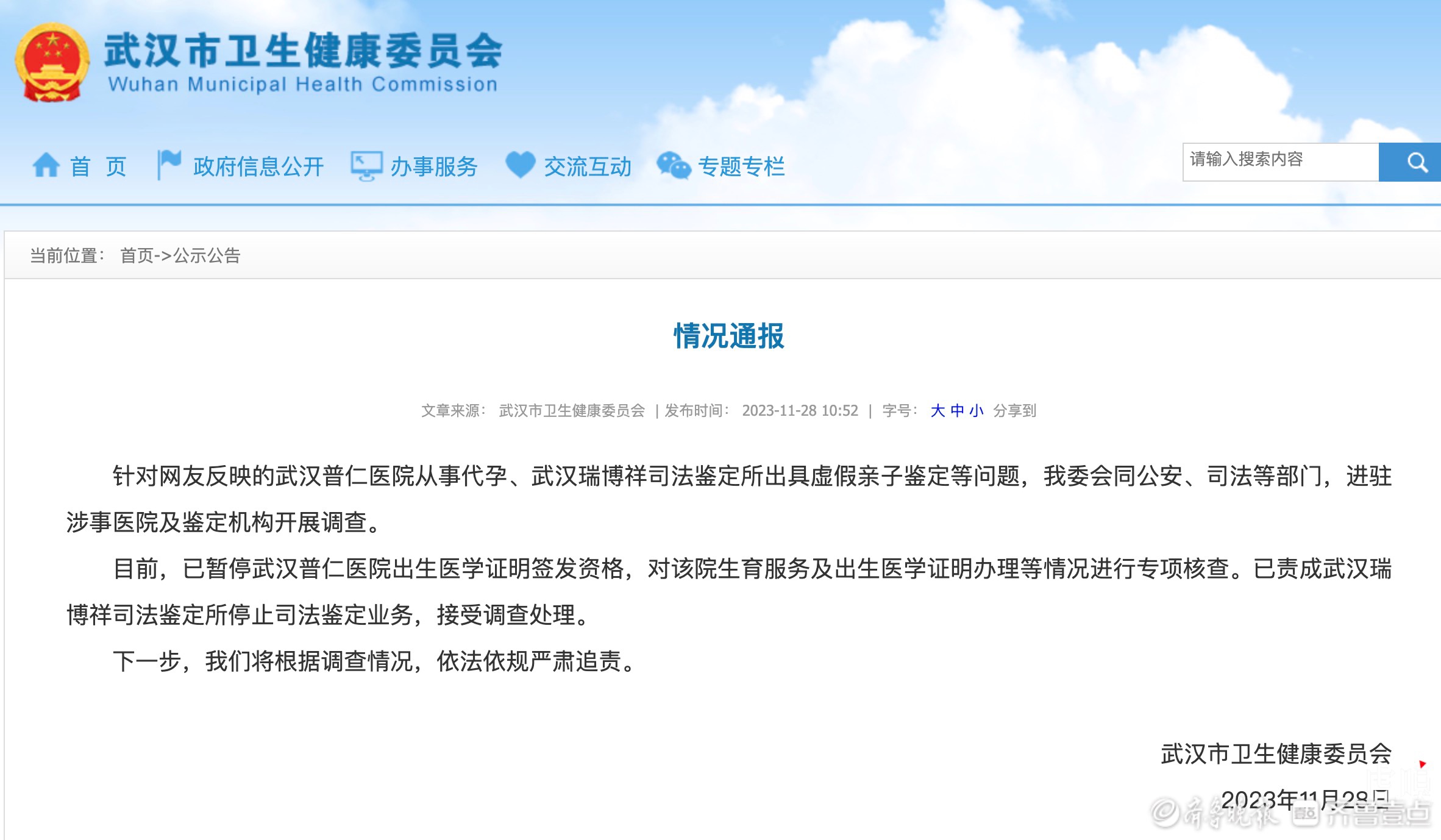 11月28日,湖北省武汉市卫生健康委员会发布通报,针对网友反映的武汉普仁医院从事代孕、武汉瑞博祥司法鉴定所出具虚假亲子鉴定等问题,武汉市卫生健康委员会会同公安、司法等部门,进驻涉事医院及鉴定机构开展调查。目前,已暂停武汉普仁医院出生医学证明签发资格,对该院生育服务及出生医学证明办理等情况进行专项核查。已责成武汉瑞博祥司法鉴定所停止司法鉴定业务,接受调查处理。下一步,武汉市卫生健康委员会将根据调查情况,依法依规严肃追责。