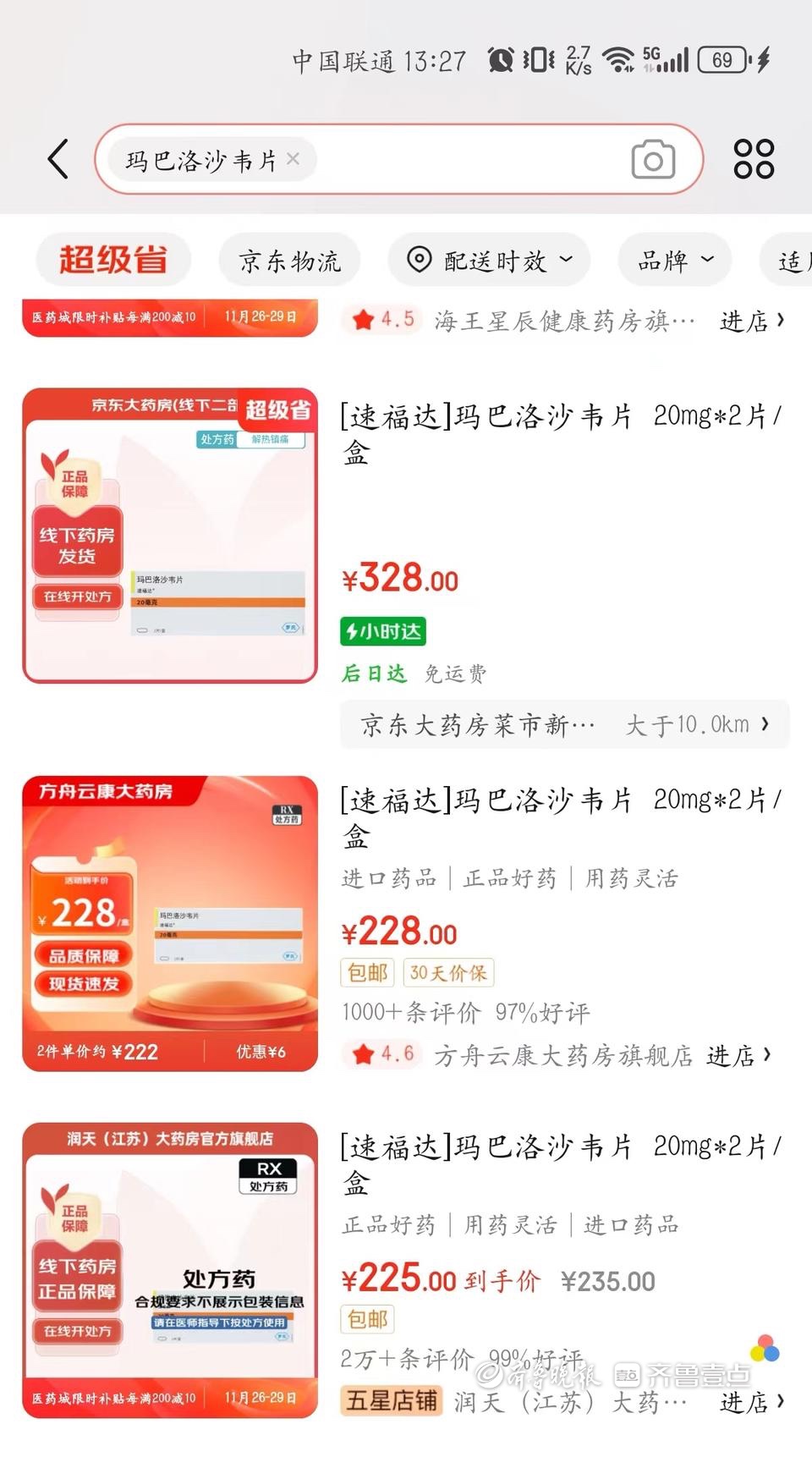 最让胡先生犯嘀咕的是,京东App上“京东大药房菜市新村店”所售卖的玛巴洛沙韦片要比其它药店的价格要高很多。“其它药店的售价都是220块钱左右,这家药店卖到了328元,贵了100多块钱。”胡先生说,他通过朋友得知玛巴洛沙韦片的进价也就两百多块钱,这款“抗流感新药”涨价幅度超过了50%,“总觉得是在‘坐地起价’。”