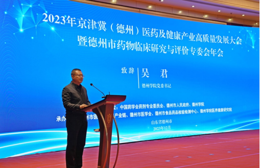 12月8日—9日,京津冀协同发展区(德州)医药及健康产业高质量发展大会暨德州市药物临床研究与评价专委会年会在德州成功召开。会议由中国药学会药剂专业委员会、德州市人民政府和德州学院共同主办,德州市医药及康养产业链、德州市医学会、德州学院医养健康研究院、德州市食品药品检验检测中心、德州市立医院(德州学院附属医院)和宁津县人民医院共同承办。会议邀请中国药学会药剂专业委员会主任委员、北京大学长聘教授吕万良,济宁医学院副书记、校长,山东省毒理学会理事长姚庆强,中国药学会工业药剂学专业委员会主任委员、医药先进制造国家工程研究中心主任王健;国家药典委员会执行委员(药剂专业主任委员)、中国药科大学二级教授周建平,中国医学科学院药用植物研究所研究员王向涛,北京大学药学部原副主任、北京大学医药管理国际研究中心主任、北京大学药学院教授史录文,北京大学药学院党委委员、院长助理、药事管理与临床药学系主任、北京大学药学院研究员管晓东,北京大学医学部药物评价中心主任,北京大学第三医院药剂科主任药师、教授翟所迪,山东省第一医科大学附属省立医院药学部主任药师高田田等专家出席。12月8号下午举行隆重的开幕式,德州学院党委书记吴君,德州市人民政府党组成员、副市长牟春雁,德州市卫生健康委党组书记、主任、二级巡视员常树风等领导出席,德州市市场监督管理局、市卫生健康事业发展中心、齐鲁工业大大学(山东省科学院)化学与制药学部、德州学院人事处、教务处、医养健康研究院相关负责人参加,开幕式由德州市政府副秘书长蔡玉虎主持。