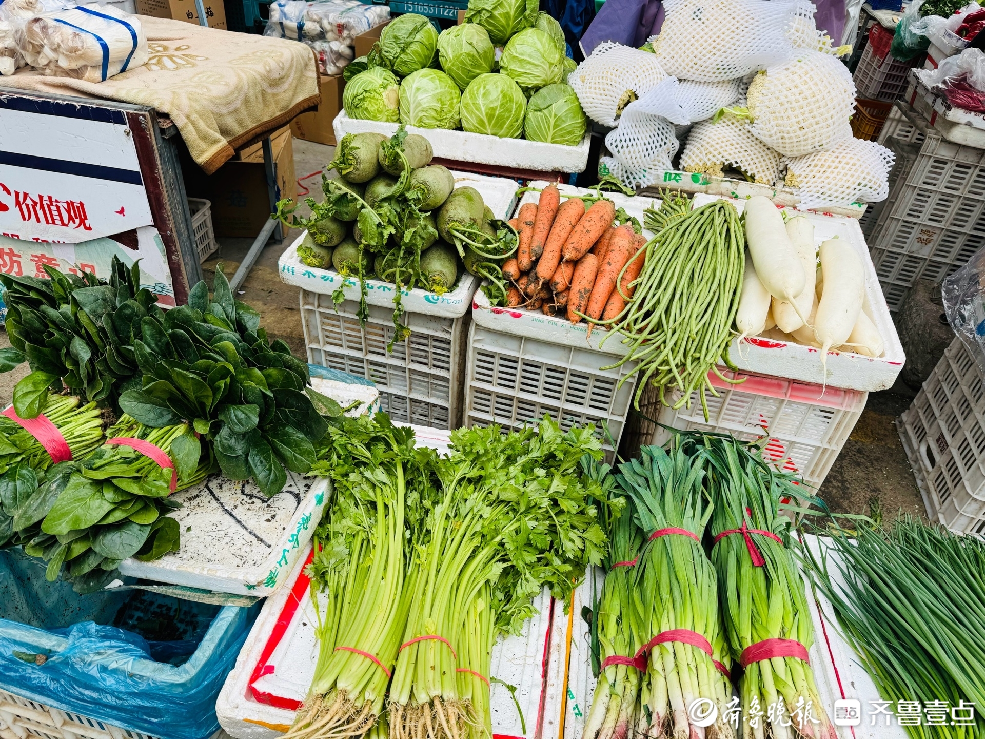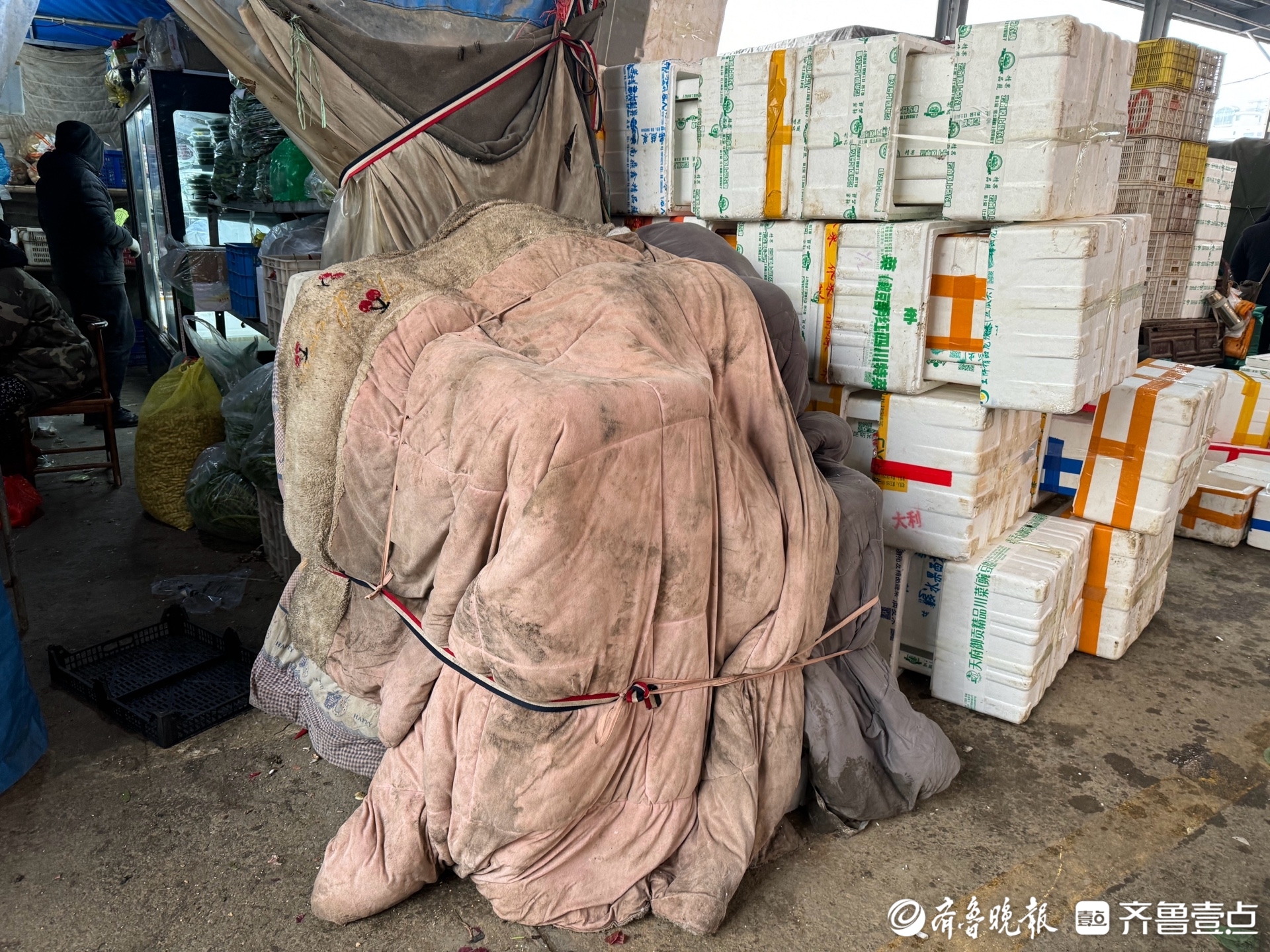 在济南七里堡蔬菜综合批发市场不少摊位上,记者看到,蔬菜已经盖上了厚厚的棉被,还有不少蔬菜放进泡沫箱里“保温”。