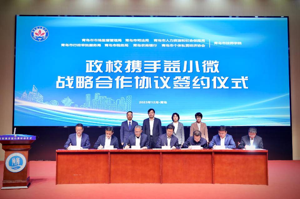12月13日上午,“政校携手益小微”启动仪式暨创业辅导讲座在青岛市技师学院举行,本次活动由市市场监管局、市司法局、市人力资源和社会保障局、市行政审批局、青岛市税务局、青岛农商银行、市个体私营经济协会与青岛市技师学院联合举办。