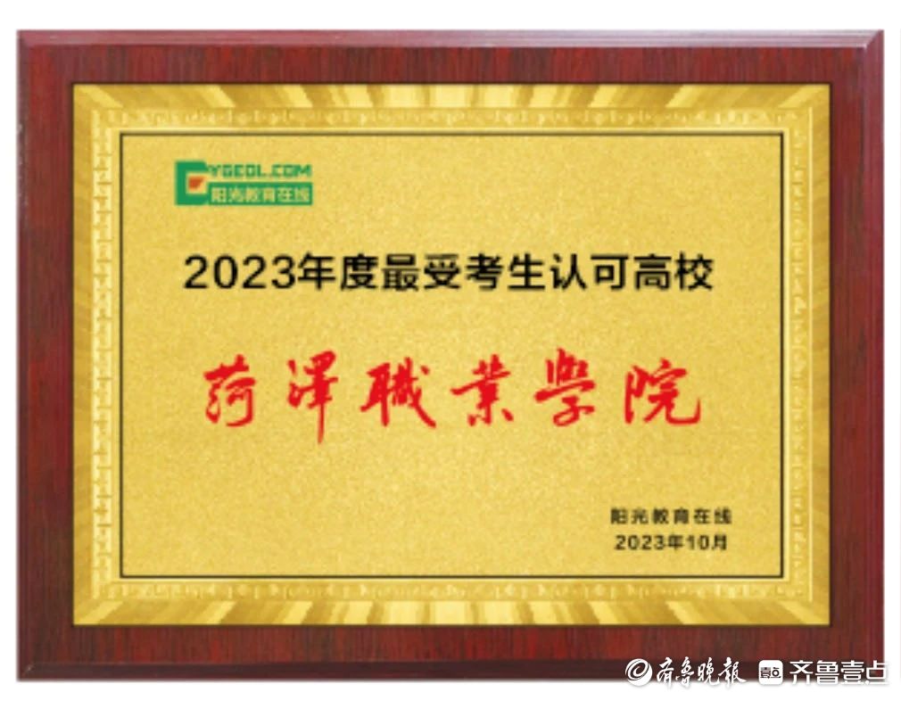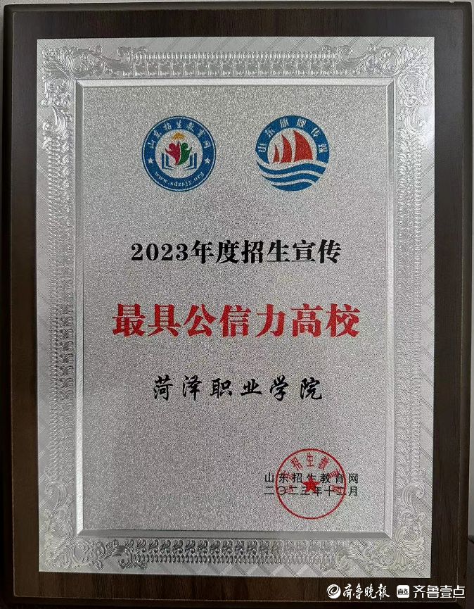 菏泽职业学院荣获2023年度招生宣传创新高校、最受考生认可高校、最具公信力高校荣誉称号,是对学校招生工作的肯定和鼓励。未来学校将继续深化招生宣传工作,努力提升学校的知名度和荣誉度,为培养社会需要的优秀技能人才贡献力量。