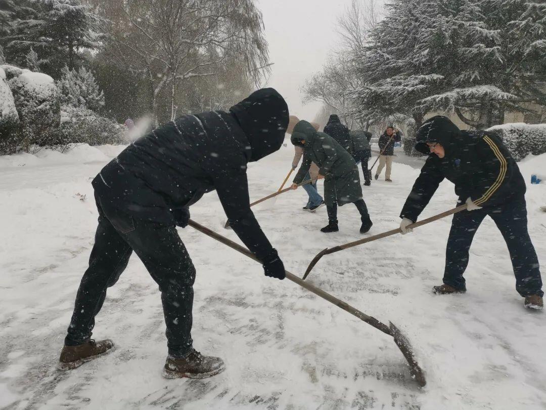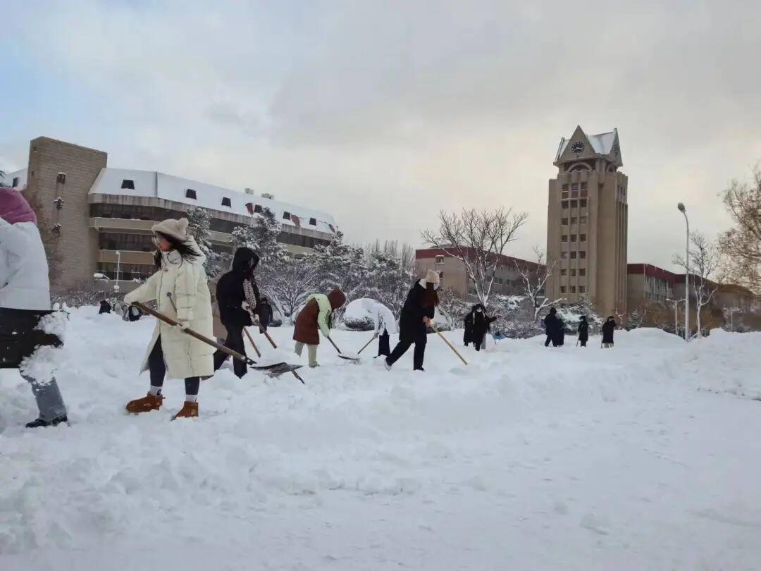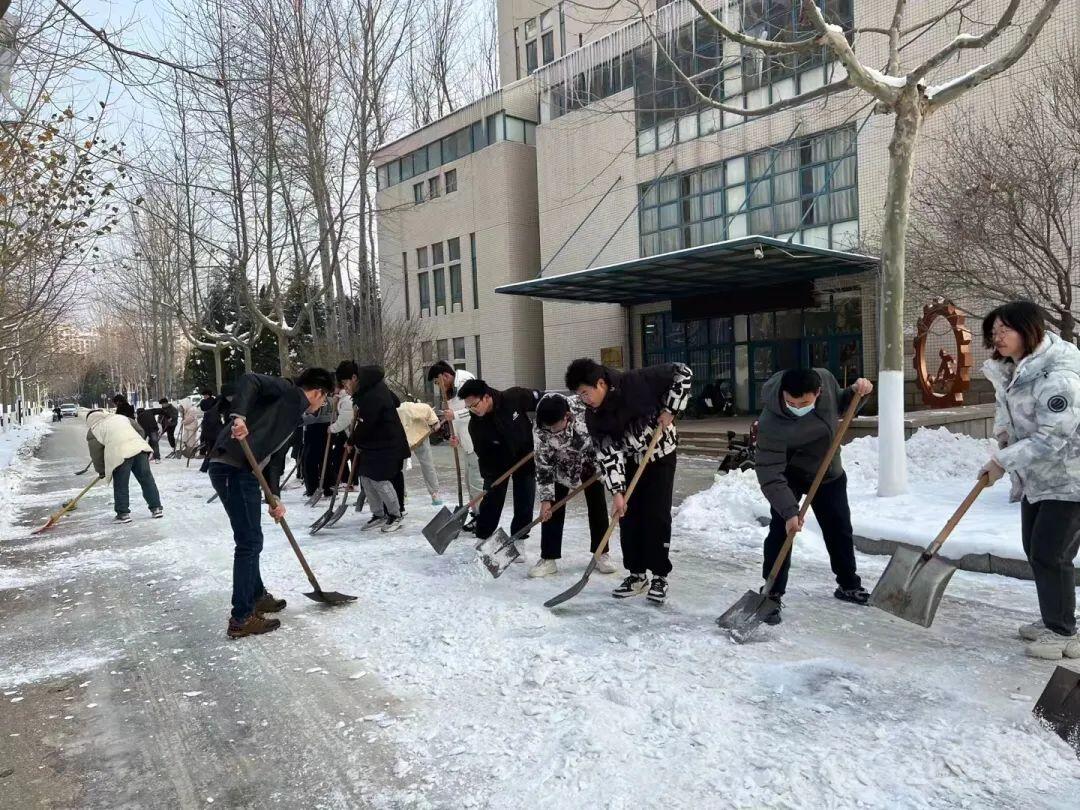 风雪虽大,但学校各部门、各学院师生员工积极响应学校号召,以“包片划区”形式做好分工,用实际行动为师生做实事,充分发挥党员先锋模范带头作用。他们利用课余、工作之余时间,挽起袖子,手持铁锹、扫帚,迎着寒风、踏着积雪,齐心协力将一条又一条道路的积雪清除。