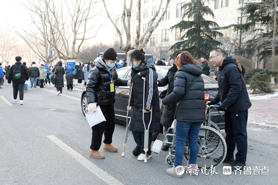 中国海洋大学考点,工作人员护送骨折学生进考场。
