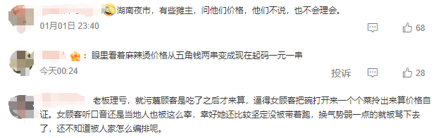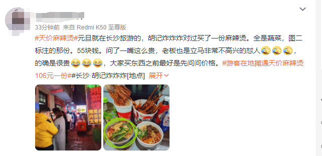 对此,有网友称“别看了,长沙自己人在长沙都要被宰”“眼看着麻辣烫从五角两串变成现在起码一元一串”;还有网友表示“湖南夜市,有些摊主,问他们价格,他们不说,也不理会”“元旦在长沙旅游买过一份麻辣烫全是菜55元钱问了一嘴怎么这么贵,老板立马非常不高兴的怼人”;也有网友指出“敢于维护自己的利益”。