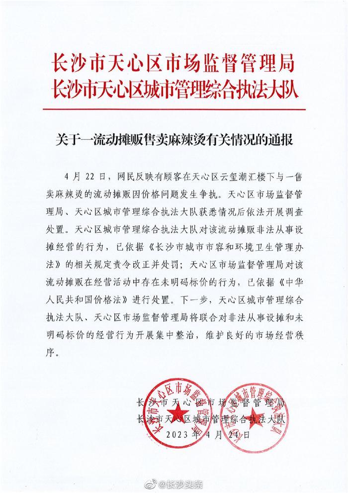 4月24日,“网信天心”微信公众号发布《关于一流动摊贩售卖麻辣烫有关情况的通报》,通报指出,天心区城市管理综合执法大队对该流动摊贩非法从事设摊经营的行为,已依据《长沙市城市市容和环境卫生管理办法》的相关规定责令改正并处罚;天心区市场监督管理局对该流动摊贩在经营活动中存在未明码标价的行为,已依据《中华人民共和国价格法》进行处置。