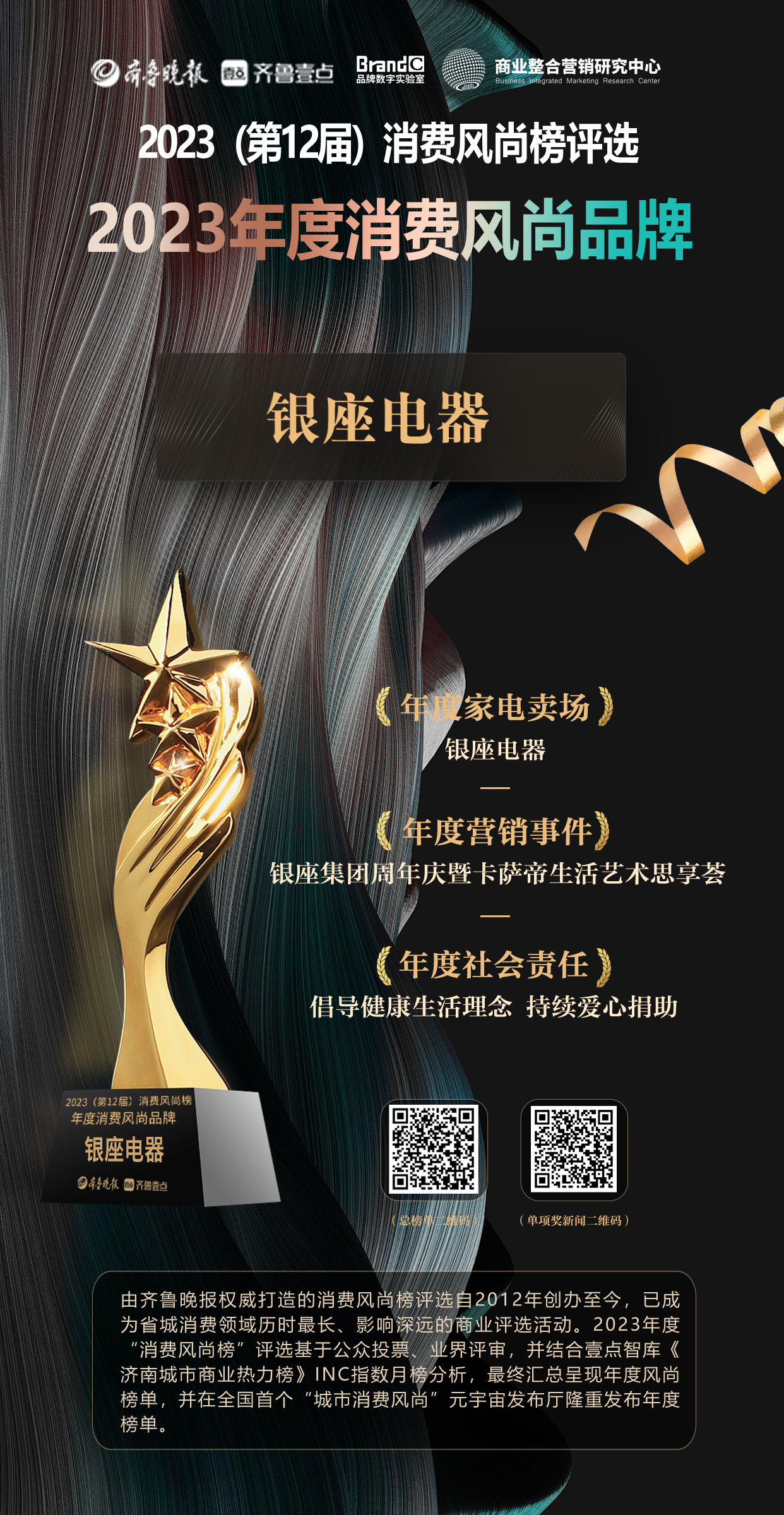 顺势蝶变,创新共生!2024年伊始,“风尚之美,城市之光”2023消费风尚榜隆重揭晓。银座电器榜上有名,荣获“2023年度消费风尚品牌”,同时凭借在2023年度积极履行社会责任、持续开拓突破的出色表现还斩获了“年度家电卖场”“年度营销事件”和“年度社会责任”三项大奖。