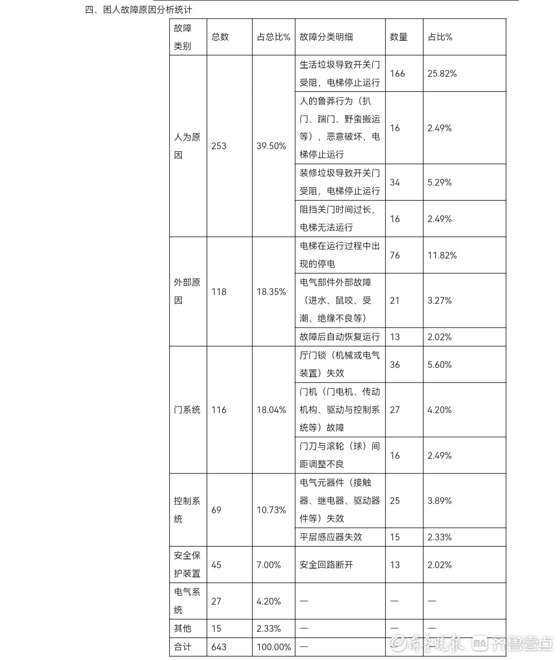 记者看到,在2023年第四季度的困人故障中,排前三位的原因分别是:人为原因253起,占困人故障总数的39.35%;外部原因118起,占困人故障总数的18.35%;门系统116起,占困人故障总数的18.04%。上述三种原因占困人故障总数的75.74%。