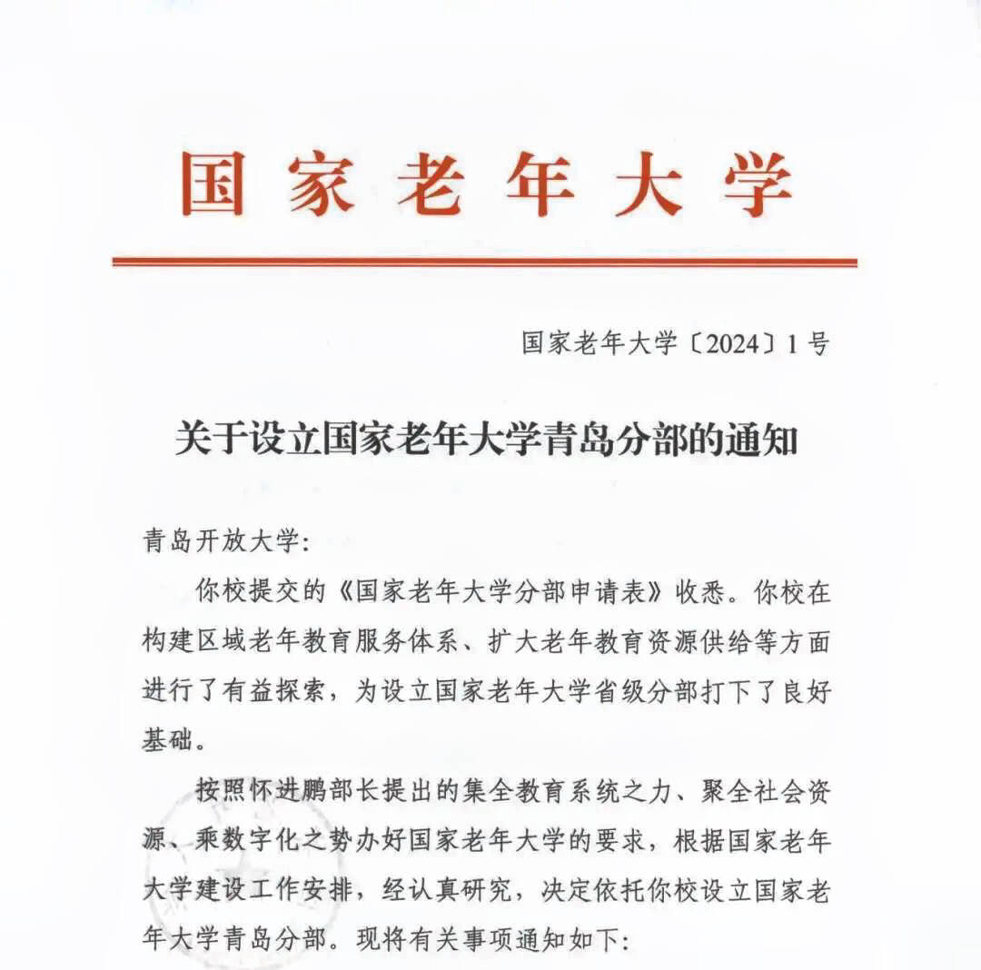 日前,国家老年大学印发《关于设立国家老年大学青岛分部的通知》,正式批复青岛开放大学成立国家老年大学青岛分部。青岛获批成立国家老年大学首批省级分部。