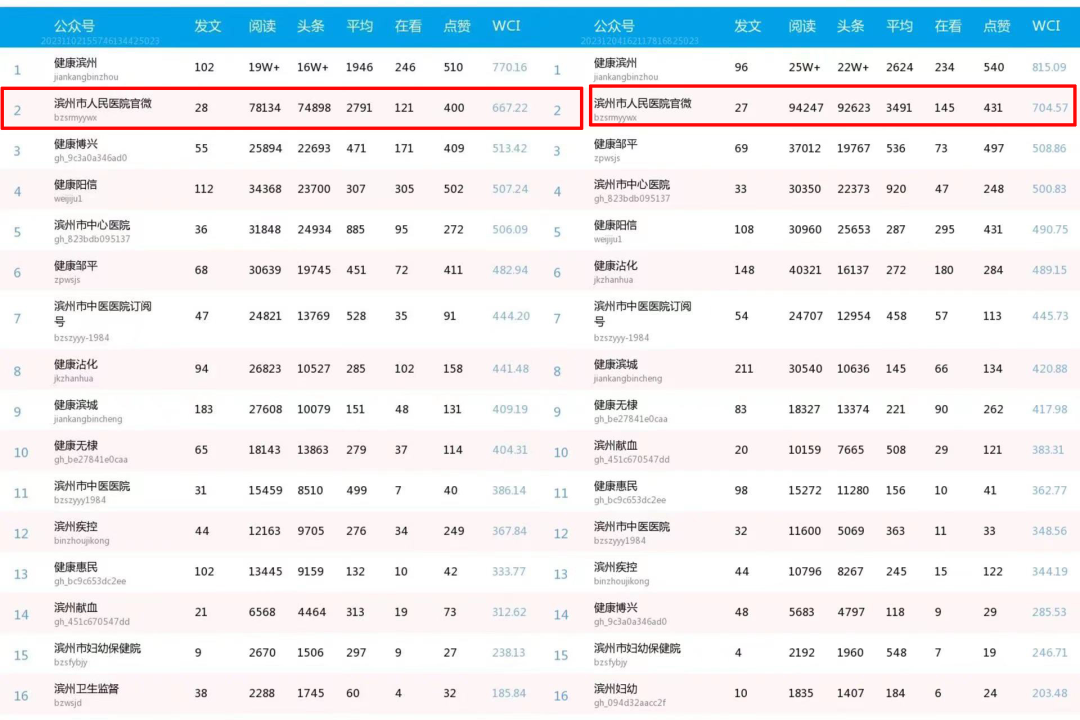 坚持立足人民、服务人民的宣传导向,医院微信公众号推文长期位于滨州卫生健康系统官微传播影响力排行榜前列。