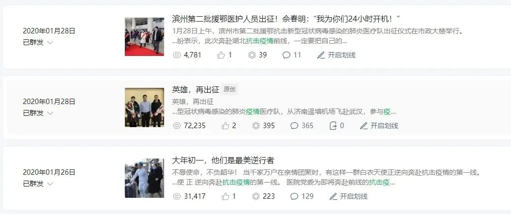 2020—2022年,是不平凡的三年。“滨州市人民医院官微”充分发挥新媒体优势,第一时间推出“抗击疫情”系列推送,以绘声绘色的形式向广大群众科普防疫知识,及时宣传疫情防控一线的先进事迹,弘扬主旋律,传播正能量。2020年微信文章《英雄,再出征!》获得山东省新闻宣传一等奖。