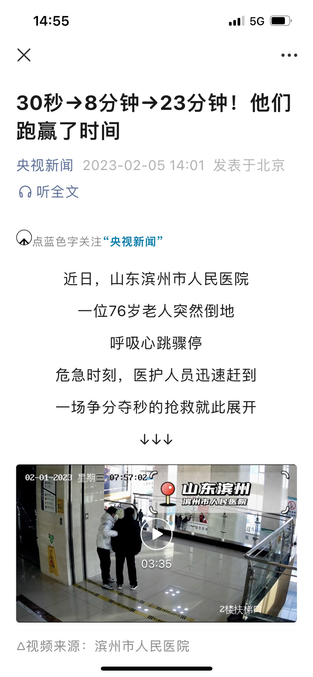滨州市人民医院官微以《滨州市人民医院:监控下的生死时速》为题,推出微信文章,浏览量近2万。健康滨州刊发,掌握滨州、大众网、齐鲁网等多家媒体转载,央视新闻以《30秒→8分钟→23分钟!他们跑赢了时间》为题刊载,浏览量10万+,彰显了救死扶伤的医者风范。