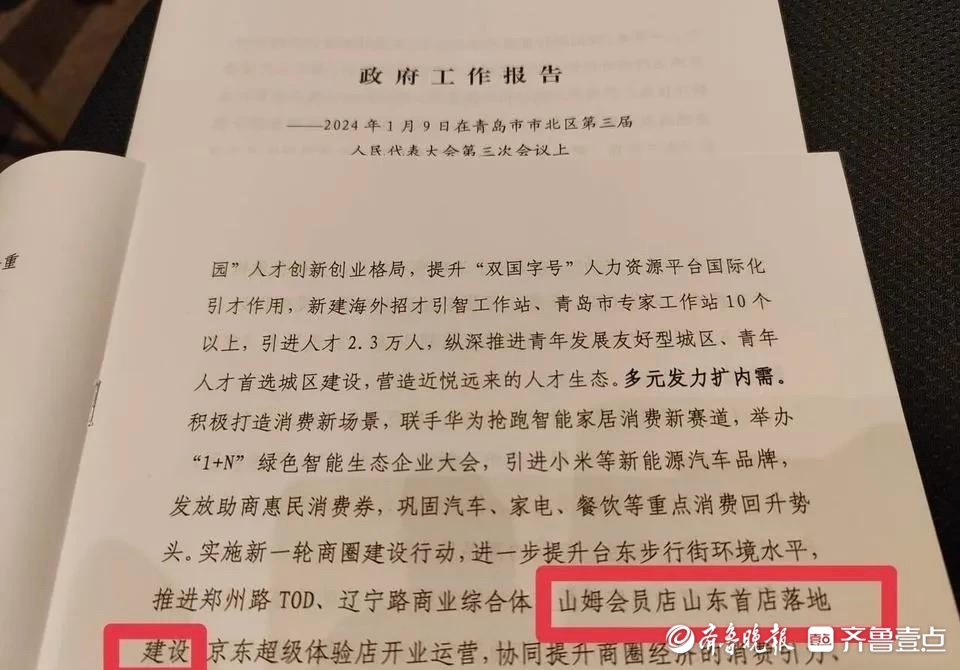 就在不少济南市民都在等着山姆的时候,又有新消息传来。2024年1月9日,一份写着“2024年市北区将推进山姆会员店山东首店落地建设”的青岛市市北区政府工作报告在网上流传开来,证实着山姆山东首店或有意向落位青岛市市北区胶州湾东岸的欢乐滨海城。