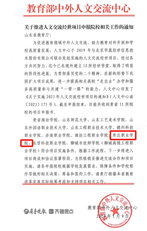 通讯员 苗仁杰 近日,从教育部中外人文交流中心获悉,枣庄职业学院获批教育部中外人文交流中心经世项目,名列全省7所高等职业院校之一。 下一步枣庄职业学院将更加重视国际交流项目建设,在山东省教育厅统筹和支持下,根据学院发展需求,制定国际化人才培养方案,培养国际化人才,依托经世国际学院开展中外合作,引进海外高校优质教育资源、开展互授联授、学分互认、国际化实习实训就业等,积极稳妥推进交流合作和项目实施,进一步促进中外人文交流工作的顺利开展。此次获批,对于促进学院高质量发展和创建国家“双高”院校将起到重要作用。