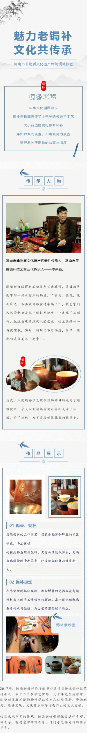 陈荣新,济南市非物质文化遗产代表性传承人、传统锔补项目第三代传承人。精湛的传统工艺拥有深厚的文化底蕴,记录了时代的发展与社会的变迁。锔补是我国独有的传承了上千年的民间手艺,随着时代的沉浮经历了繁荣与衰落。