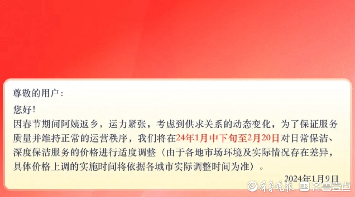 济南市历下区市场监督管理局物价科的工作人员解释,家政服务行业收费属于市场行为定价收费,由经营主体自主制定。在春节前后涨价是由供需关系决定的,只要在服务前,对于所售项目的价格进行了充分的、透明的、合理的公示,尊重了消费者的知情权,就是合法行为。但涨价幅度应在合理范围内,让消费者明明白白消费,不能利用节日之机进行价格欺诈。
