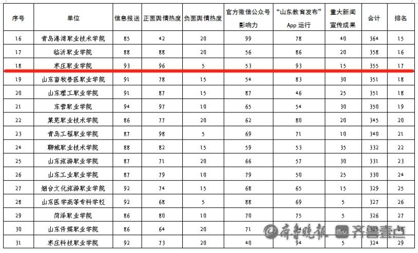 本次通报从信息报送采用情况、正面舆情热度、负面舆情热度、官方微信公众号影响力情况、“山东教育发布”App运行情况、重大新闻宣传成果六大类指标进行量化赋分和审核认定赋分,评出各单位综合分数及排名情况。