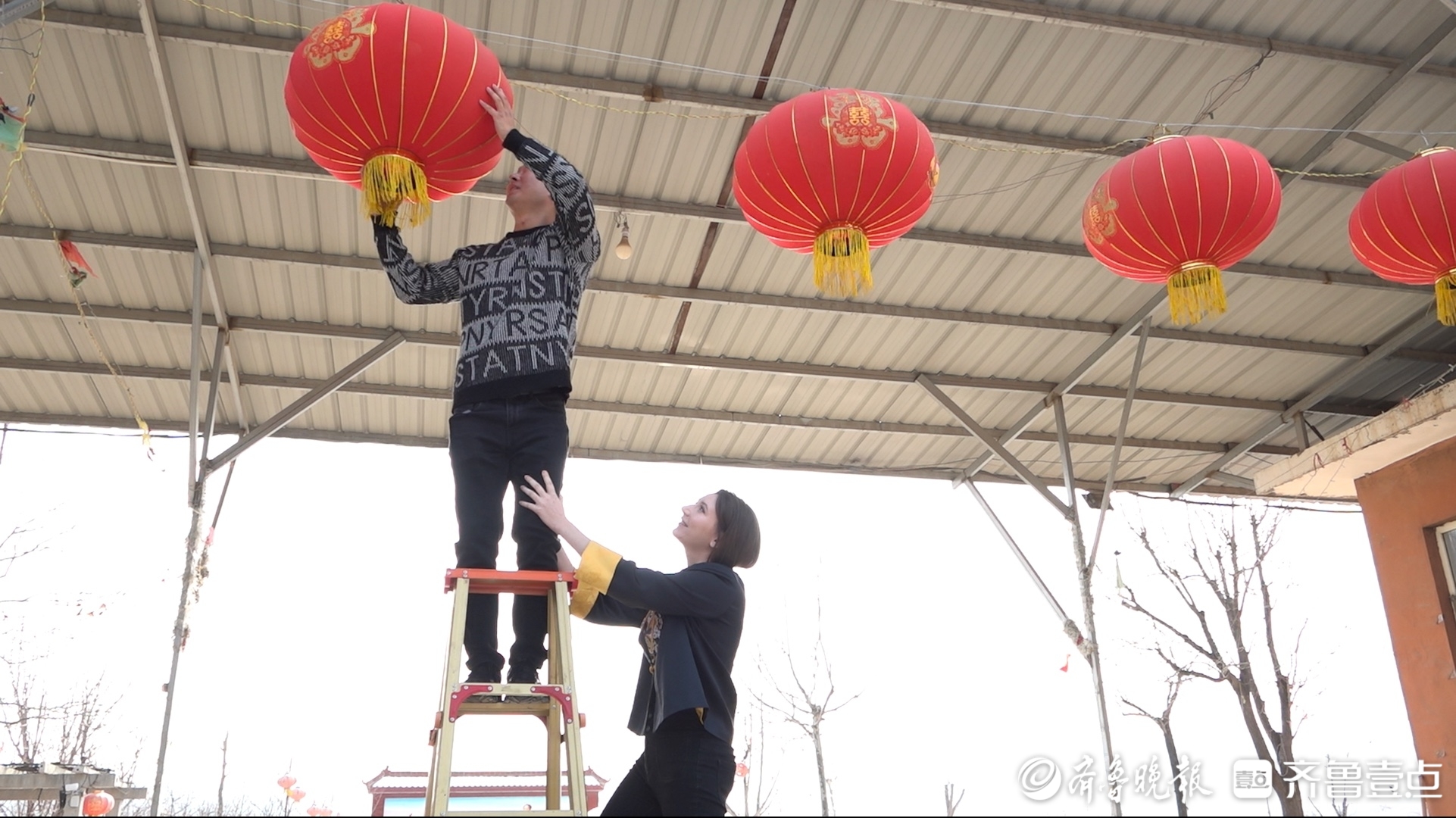 “我们来贴!”刘强的父亲则发动起大家,有人在户外贴春联,有人在屋内贴着窗花,刘强则搬来梯子和纳斯加一起把红灯笼高高挂起,孩子们在院子里跑来跑去。